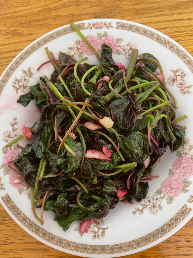 雖說民以食為天,年如今纪大了,一切都趨於簡單。簡簡單單的兩盤蔬菜,紅莧菜和大蒜空心菜,再配上一個葷菜。足已!