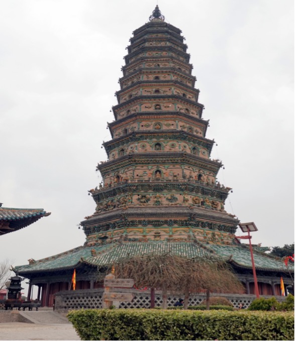 它屹立於山門的正面,呈八角形共13層,塔身高47.31米。塔身由青磚砌成,各層皆有出檐。 全身用黃、綠、藍三彩琉璃裝飾,一二三層最為精緻,檐下有斗拱、倚柱、佛像、菩薩、金剛、花卉、盤龍、鳥獸等各種構件和圖案,捏製精巧,彩繪鮮麗,至今色澤如新。塔頂建有鐵製法輪,中鑲風磨銅塔剎,約重67.2市斤。塔中空,但現在已經關閉不能攀爬。據說內有踏道翻轉,盤旋而上,設計十分巧妙,為我國琉璃塔中的代表作。清康熙三十四年(1695)臨汾盆地八級地震,此塔安然無恙。