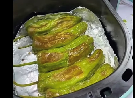 (2)取出後,把青椒翻面,再放進氣炸鍋内。使用190度再烤4分鐘。