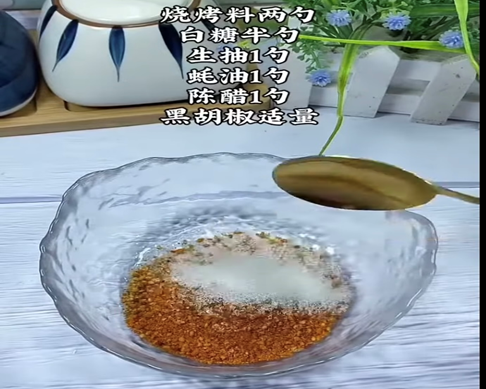 (3)用一小碗製作調料。燒烤料 2 勺、生抽1 勺、蠔油1勺、陳醋1勺、黑胡椒適量。平均抹勻調料。烤虎皮青椒 大功告成!