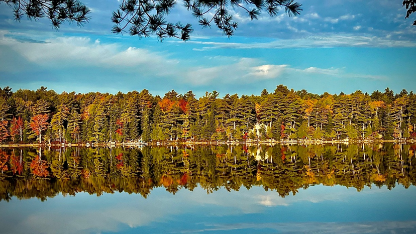 層巒盡染色斑斕,秋水波平倒映山。