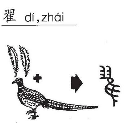 第一個故事中的問題,答案很簡單。翟是個象形字,原意是長尾巴的雉(野雞,見下圖)。 di是翟字的古音,zhai是翟的近代發音。翟在上古發音近似於di,而不會唸成zhai,這是因為古漢語中沒有現代漢語中的zh、ch、sh這些捲舌音聲母。這些捲舌音在上古都唸成d,t的舌尖音。這是一個非常有趣的發現,叫做“古無舌上音”,而且在文字和方言中得到了廣泛的印證。翟唸成zhai的音發生較晚,並且經過了中古和近代兩次大的語音轉變(見下文)。