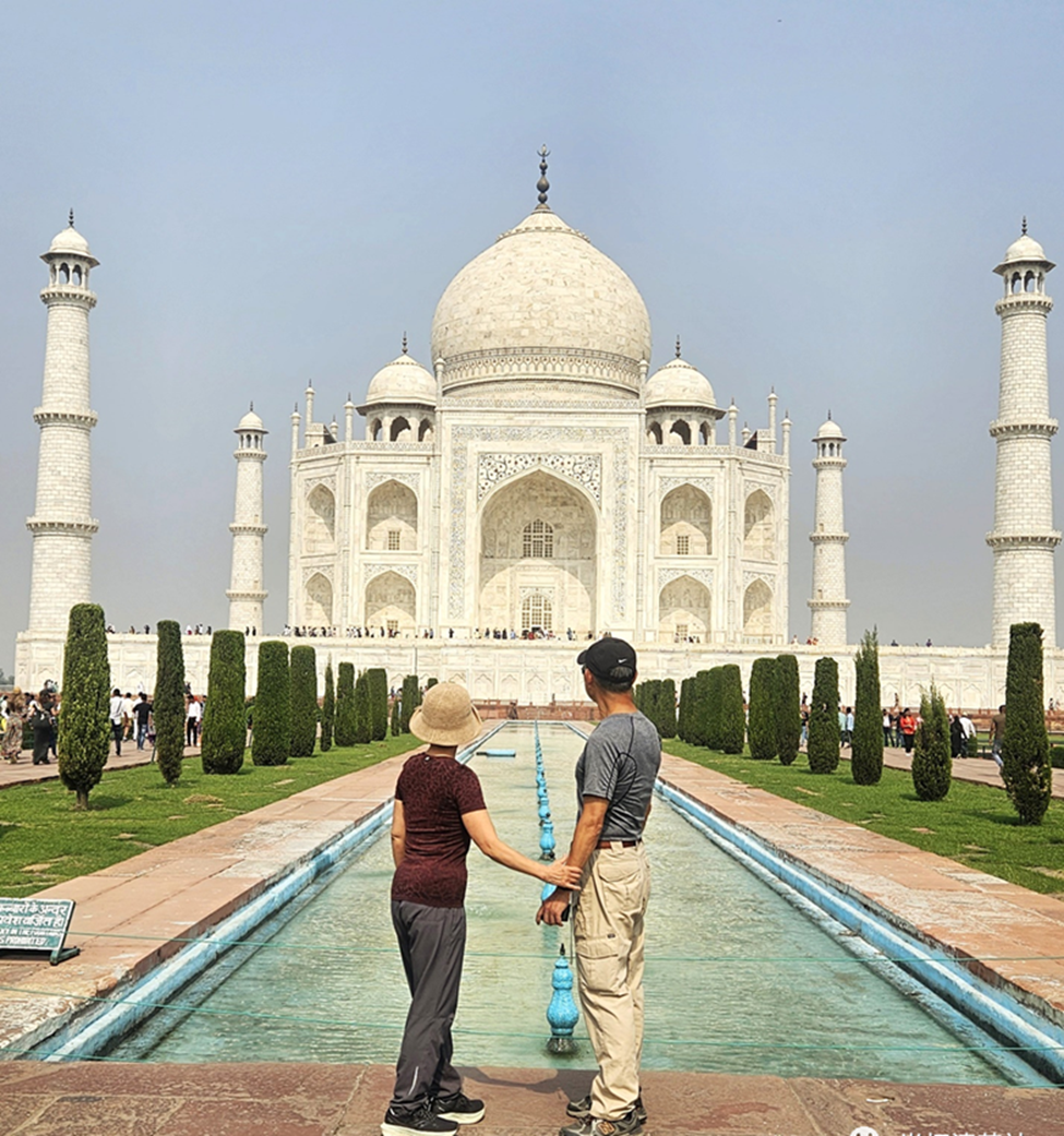 遊覽過世界上許多地方,見過污染嚴重的,卻沒有見過像德里周邊這樣糟糕的。清晨乘直達列車從德里到阿格拉,鐵路兩邊百米之外,房屋和樹木都是灰色的剪影。太陽像是一個大橘子懸掛在空中。多數路旁的景象彷彿是沒人看管的工地。也許是剛從明麗的山國不丹來此,强烈的反差給我們帶來的感觸太大了。阿格拉距德里230公里,直達列車兩個小時到達。或許是期待值不大,到達阿格拉之後心境立馬改變了。這裡空氣清爽多了,街道也顯得整齊乾净。而一進入泰姬陵,宛如踏入一方净土。不,這裡堪稱人間天堂。泰姬陵名列世界中古七大建築奇跡之一,她是莫臥兒王朝第五代君主沙·賈汗為其皇后瑪哈爾所建,用了兩萬多人力,耗時22年建成。整個泰姬陵占地很大,由前院花園、正門樓、主花園、陵墓主建築和兩側清真寺組成。陵墓主殿的建築材料為白色大理石,並以寶石、水晶、瑪瑙和珊瑚等名貴材料鑲嵌,建在高高的臺基之上,呈八角形,中央頂部是半球形的穹頂。主殿大廳中央的大理石屏風内并排放著皇帝和皇后象徵性的雕花石棺,他們的真正棺槨在大廳地下。主建築四角各有一座圓柱形高塔。整個建築造型精美,壯麗輝煌。陵墓主殿前水池中的倒影與主建築交相輝映。據説,泰姬陵的色彩會隨著季節和時間變化,呈現潔白、金黃、琥珀和灰白色,在朗月當空的夜晚,還會發出淡淡的紫色,清雅出塵,美得無法用語言形容。我們是在近中午時分到達的。青天白雲之下的泰姬陵散發著潔白的光艷,美得讓人嘆爲觀止。