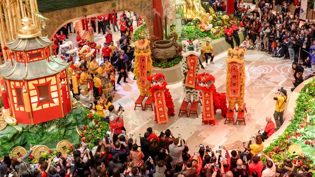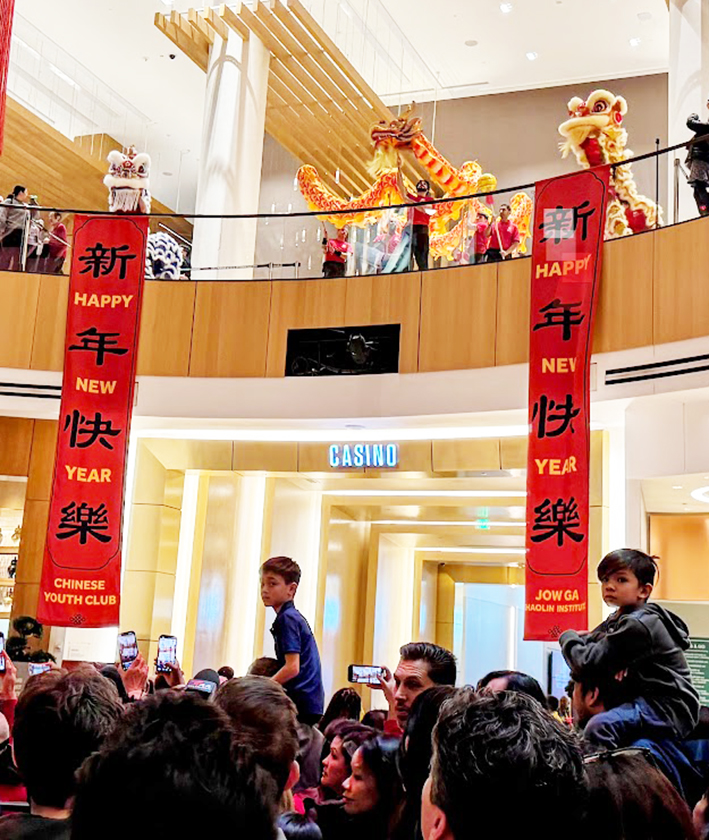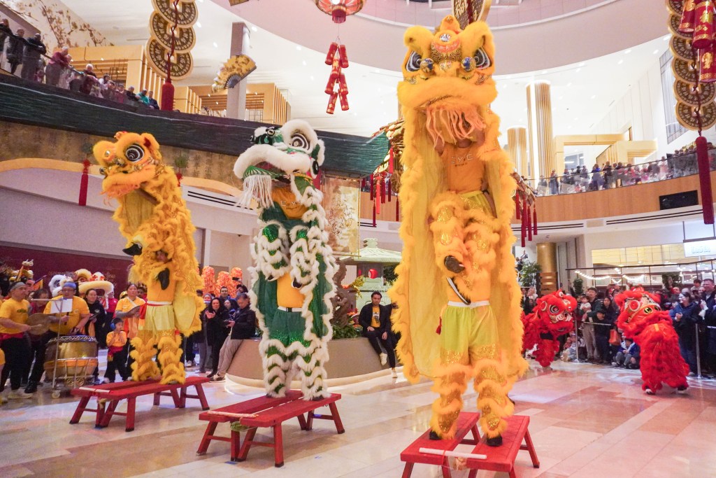 【華府新聞日報李靜芳報導】喜迎馬年來臨,位於華府近郊,波多馬克河畔的國家港美高梅度假村及博藝中心(MGM National Harbor),張燈結綵,喜迎嘉賓。走進大廳,聳立中庭的金錢樹迎面而來,巨型的駿馬奔騰橫空出世,氣勢磅礡,雄渾壯觀,散發出「萬馬奔騰」的馬年氣象,以及濃濃郁郁的農曆春節氛圍,熙來攘往的人潮,盡享博彩、美食、美景、度假和娛樂一處到位的舒暢。農曆春節前的小年(2026年2月15日,星期日),鑼鼓震天價響,巨龍和醒獅齊聚,躍動起舞,猛獅獻瑞,巨龍呈祥,招財進寶,喜迎馬年。