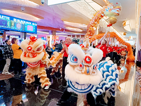 在舞龍舞獅開始之前美高梅營運副總裁Alex Alvacardo為祥獅點睛,並致詞向成千上百的圍觀賓客賀新年,祝大家馬年行大運,財源滾滾。